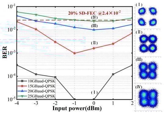 To evaluate the performance of the hybrid RF/FSO system, experiments were conducted over a 1 m wireless transmission distance. For the RF link, Figure 6 illustrates the bit error rate (BER) curves for QPSK signals at baud rates of 10 GBaud, 15 GBaud, 20 GBaud, and 25 GBaud, with input power to the photodiode (PD) ranging from −4 to 2 dBm. The measured BER values satisfied the 20% soft-decision forward error correction (SD-FEC) threshold of 2.4 × 10−2. The BER initially decreased with increasing input power but began to rise beyond approximately 0 dBm, attributed to signal saturation over the short transmission distance, which degraded signal quality. For the FSO link, no errors were observed at the tested baud rates and input optical powers. Consequently, the hybrid RF/FSO system successfully supported 25 GBaud QPSK fusion transmission over the 1 m wireless link.
