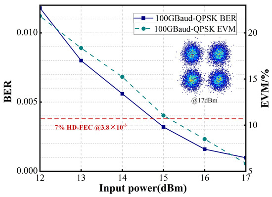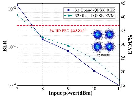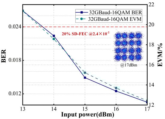To further evaluate the system’s performance, the baud rate in the FSO link was increased. As the BER and error vector magnitude (EVM) shown in Figure 7 and Figure 8, the FSO link supports 32 GBaud QPSK transmission when the optical power input to the GRIN lens exceeds 7 dBm, meeting the 7% hard-decision forward error correction (HD-FEC) threshold of 3.8 × 10−3. Additionally, at input optical powers above 12 dBm, the system achieves 100 GBaud QPSK transmission while satisfying the 7% HD-FEC threshold of 3.8 × 10−3. Furthermore, as illustrated in Figure 9, the system supports 32 GBaud 16QAM transmission at input powers exceeding 13 dBm, meeting the 20% SD-FEC threshold of 2.4 × 10−2.