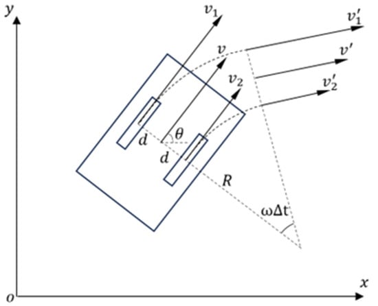 During the motion of the differential drive chassis AGV, let the time step be , and denote the coordinates of the equivalent point as with an orientation angle relative to the positive x-axis of the world coordinate system. The state update equations for the equivalent point are as follows: