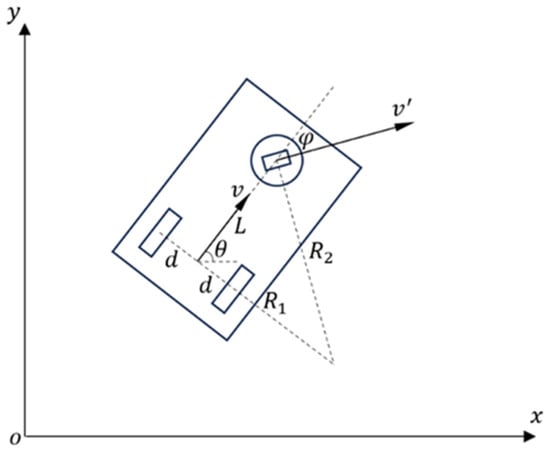 During the motion of the single-steering wheel chassis AGV, let the time step be , and denote the coordinates of the equivalent point as with an orientation angle relative to the positive x-axis of the world coordinate system. The state update equations for the equivalent point are identical to those of the differential drive chassis AGV and are given as Equation (2).