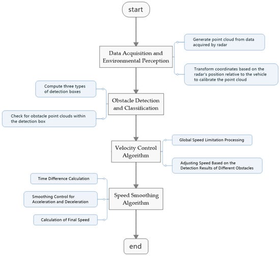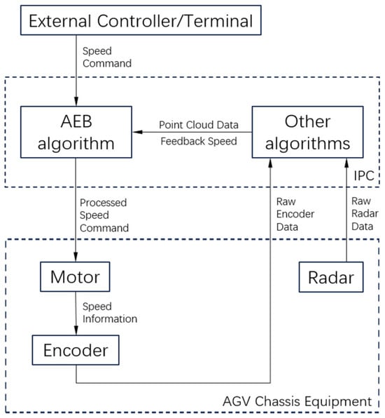The AEB algorithm is a technology that enables dynamic obstacle avoidance and safety braking based on real-time sensor data. Its core objective is to assess potential collision threats and implement appropriate braking measures, even in scenarios where navigation and localization are ineffective or restricted. As shown in Figure 3, the application of the AEB algorithm in AGVs consists of the following key modules: