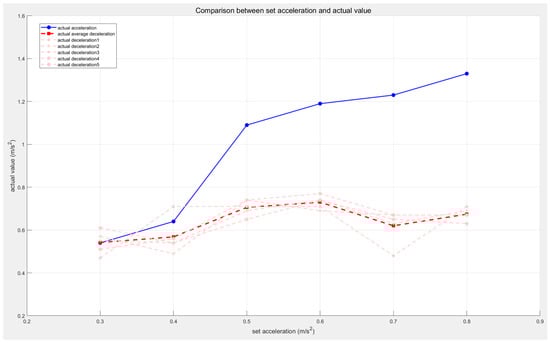 The AGV starts from an initial stationary state, accelerates to its maximum speed, and maintains a constant velocity. Timing begins after passing the starting point and ends when the AGV comes to a stop. In this experiment, the AEB algorithm is configured with single-stage deceleration parameters to simulate the standard emergency stop. The emergency stop time using the AEB algorithm’s multi-stage deceleration and the emergency stop time using conventional emergency braking are measured, allowing for the calculation of the Emergency Stop Avoidance Rate ().