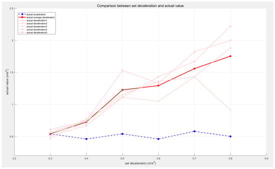 Based on the experimental results, the blue curve in Figure 20 represents the relationship between and time , the orange curve represents the relationship between AEB algorithm deceleration and time , and the green curve shows how the Emergency Stop Avoidance Rate () changes with . From the figure, it can be observed that before approaches the normal emergency stop trigger time, neither the AEB algorithm deceleration nor the normal emergency stop deceleration causes an emergency stop, and is 0. As approaches the critical point of normal emergency stop triggering, the AEB algorithm effectively avoids the emergency stop by decelerating in advance, and reaches 100%. As increases, both the AEB algorithm’s and the normal emergency stop’s emergency stop rates start to rise and gradually decreases. Finally, when both emergency stop rates reach 100%, drops to 0. After calculating the average value of over the interval from the first point where is non-zero to the last point where is non-zero, the result is shown in Table 10.