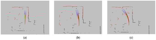 The detection region’s bounding box is classified into three state types: , , and , with the priority decreasing in the same order. indicates that the obstacle is too close, requiring the AGV to stop immediately; indicates that the obstacle is relatively close, prompting the AGV to gradually reduce its speed until it comes to a halt; and indicates that the obstacle is at a safe distance, allowing the AGV to decelerate according to the set parameters. When the obstacle’s point cloud enters the corresponding detection box, the system will adopt the appropriate obstacle avoidance strategy based on the current state.