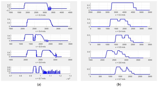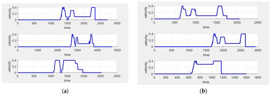 After completing 10 sets of experiments, the results indicate that both algorithms can effectively avoid obstacles and are capable of restarting or accelerating after the obstacle is removed, ultimately reaching the endpoint successfully. Figure 16 presents the speed–time curves for these 10 experiments.