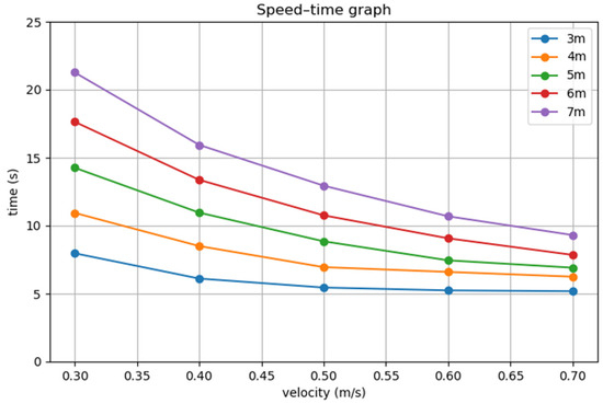 The experiment varies the distance between the obstacle and the starting point, the maximum speed sent to the AGV, and the deceleration rate for the AGV’s multi-stage deceleration. The motion time of the AGV is measured under different conditions. The parameters for both obstacle avoidance strategies and the values of experimental variables are listed in Table 9.