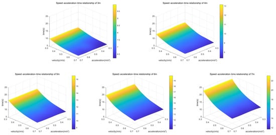 Three-dimensional plot of speed, acceleration, and emergency stop occurrence time corresponding to obstacles at different distances.