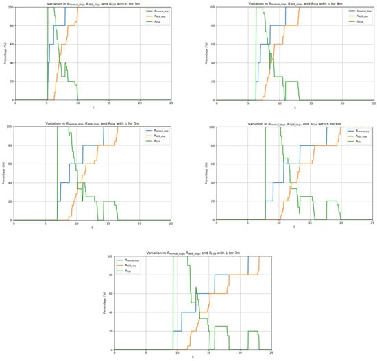 Finally, the images showing , , and as a function of for different obstacle distances are presented in Figure 20.