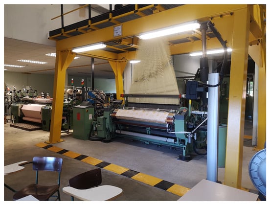 The fabric is made with cotton yarns in the warp and cotton/polyester mixed yarn in the weft. During the manufacturing process, conductive yarns are introduced in the weft and warp directions. Previous work by the authors explains the process in detail []. Figure 2a shows the capacitive woven sensor presented.