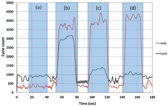 The response of the sensor during these four states, measured by the cycle count measurement circuit, is shown in Figure 5. In the graph, the data obtained from the woven sensor placed on the backrest (black line) and the seat (red line) of the car seat provide information to identify different positions and situations of the driver. At rest (State 0), there is no person sitting above the sensor (Figure 4a), which is shown by the constant values of the cycle count measured by the microcontroller. For the next positions taken by the driver over the car seat, shown in Figure 4b–d, the graph shows how the sensor response is related to the position taken by the driver, States 1, 2, and 3, maintaining the value for the seat sensor and reducing the cycle count value for the backrest sensor as the distance between the driver’s back and the seat increases.
