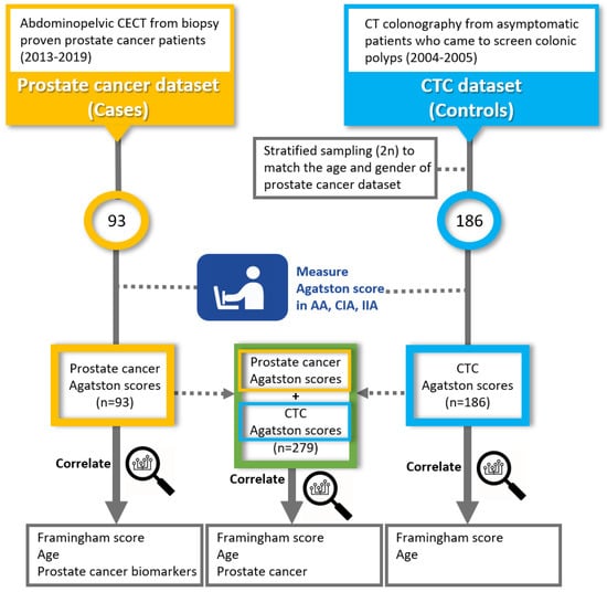 This case-control study involved comparing the plaque burden of a prostate cancer patient group with an age- and gender-matched control group of asymptomatic outpatients undergoing a screening CT colonography (CTC). The primary objective was to see if the abdominal Agatston scores had an association with a prostate cancer diagnosis, prostate cancer-related biomarkers, and the Framingham risk score (a score that estimates the 10-year risk of manifesting clinical CVD) []. A flow diagram of the study design can be found in Figure 1.