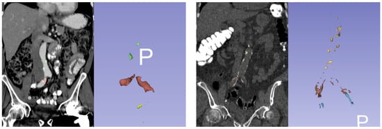 Example of Agatston score measurement. (left) A 72-year-old male with prostate cancer. Agatston scores for abdominal aorta (AA), common iliac arteries (CIA), and internal iliac arteries (IIA) were 752, 3932, and 506. (right) A 74-year-old asymptomatic male from the control group. Agatston score for AA, CIA, and IIA were 2814, 3265, and 1555. Plaques in AA, CIA, and IIA are colored differently. 3D images are facing anterior to posterior (P).