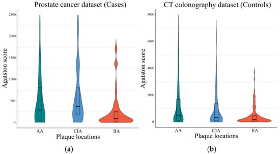 This study has several limitations. The Cases dataset was relatively small; therefore, small differences with the Controls could be missed. However, small differences are not likely to be clinically significant. Our findings warrant confirmation in a larger dataset. As mentioned above, there are other possible confounding factors besides age and gender between the Cases and Controls. Although the age was matched and the Framingham risk scores were not significantly different, known confounding risk factors such as obesity and cholesterol were not separately corrected, and this may have affected the plaque scores. Agatston score measurements can also be influenced by several other factors, including scanner type, tube current, voltage, kernel, and slice thickness [,,,,]. In this study, the tube voltages were all 120 kVp, and the slice thickness was identical for all datasets, but other factors were not matched, and these factors may have an effect on the Agatston scores. Although the CT colonography group was used as the non-cancer control group for this study, undiagnosed prostate cancer may be a possibility, as prostate cancer is suggested to be a slowly developing disease with a long preclinical phase []. In long-term follow-up, however, only 2 of the control patients were diagnosed with prostate cancer.