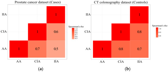 In the Cases dataset, there were high correlations between the Agatston scores of the AA, CIA, and IIA (Spearman’s Rho ≥ 0.5). The Controls dataset also showed similar high correlations between the Agatston scores of the AA, CIA, and IIA (Spearman’s Rho ≥ 0.7). Correlation heatmaps can be found in Figure 4.