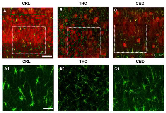 No significant qualitative or quantitative alterations in astrocytes were observed in slices treated for 24 h with either cannabinoid (data not shown). The effect of 72 h exposure to THC or CBD was also evaluated on astrocytes viability in CA1 SP and SR of organotypic slices. Figure 4A–C show the merged confocal images of astrocytes (green) and neurons (red), and panels (A1–C1) show the enlargements of astrocytes in the corresponding dotted areas in A–C. Qualitative analyses indicate that 72 h THC exposure modified astrocytes morphology in CA1. Indeed, after prolonged treatment with THC, the branches of astrocytes in CA1 SP, compared with those of astrocytes in control and CBD-treated slices, appeared twisted and swirling, highly fragmented, and had lost their most distal processes (Figure 4(B1)), a modification named clasmatodendrosis by Cajal []. Furthermore, in THC-treated slices, the immunostaining of GFAP in astrocytes was less intense, as shown by the quantitative data reported in the graph of Figure 4D,E. Quantitative analyses demonstrated that 72 h exposure to THC significantly decreased GFAP expression both in CA1 SP (−34% vs. controls, ** p < 0.01 THC vs. CRL, one-way ANOVA and Neuman–Keuls post hoc test) and SR (−36% vs. controls, * p < 0.05 THC vs. CRL). The effect of CBD was statistically significant only in SP (−29% vs. controls, * p < 0.05 CBD vs. CRL), but not in SR (n.s.).