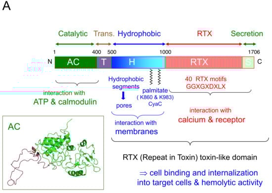 - Bejerano, M.; Nisan, I.; Ludwig, A.; Goebel, W.; Hanski, E. Characterization of the C-terminal domain essential for toxic activity of adenylate cyclase toxin. Mol. Microbiol. 1999, 31, 381–392. [Google Scholar] [CrossRef] [PubMed]