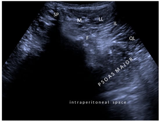 Ultrasound imaging (axial view) for psoas major muscle. SP: Spinous process; F: Facet joint; M: Multifidus; LL: Longissimus lumborum; IL: Iliocostalis lumborum; QL: Quadratus lumborum.