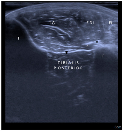 Ultrasound imaging (axial view) for tibialis posterior muscle. TA: Tibialis anterior; T: Tibia; F: Fibula; EDL: Extensor digitorum longus; FL: Fibularis longus; a: Artery; n: Nerve; *: Interosseous membrane.