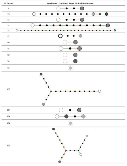 Maximum likelihood trees of the populations found from each individual. Circles represent distinct genotypes, and are shaded according to the time of isolation of the genotype: white is earliest, darkest grey is latest. Branches between nodes are shaded according to the types of variants found: intergenic (grey), synonymous (green), nonsynonymous (orange) and nonsense/premature codon stop (red). SNPs and indels are represented by solid and dashed lines, respectively. Small black circles represent hypothetical intermediate genotypes. Data from 25 individuals is shown.