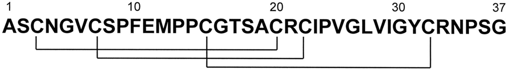 PA1b is a peptide consisting of 37 amino acids, including six cysteines involved in three intramolecular disulfide bridges (Figure 1). The three-dimensional structure of the peptide has revealed that it belongs to the cystine knot inhibitor (ICK) family ([5], see Section 6). This folding confers a very high level of resistance: the PA1b peptide maintains its biological activity after boiling [3], following extraction by different solvents or solutions (methanol, pentane, ether acetate, acetone, 15% TCA in water or 5% NH3 in water, after digestion by proteases (including trypsin, papain and proteinase K, with the exception of pronase E) or digestion by the gut extract of insect or rumen degradation [6,7,8]. These characteristics also permit a simple purification process of the PA1b peptide, from pea flour, by solvent extraction and classical reverse-phase HPLC [3].