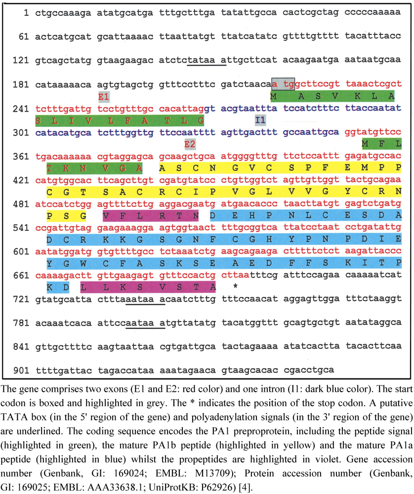 The structure of the pea albumin 1 reference gene (PA1 gene) is depicted in Figure 2. It was first described, in 1986, by Higgins et al. [4]. Two exons, separated by a short intron located inside the coding leader sequence, are present in the gene. The PA1 gene is transcribed as a single mRNA encoding the preproprotein PA1 [molecular weight 13.9 kDa; 130 amino-acids (aa)] which is co-translationally targeted to the endoplasmic reticulum (ER) by cleavage of its signal peptide (2.7 kDa, 26 aa). The proprotein precursor (11.2 kDa, 104 aa) is directed to the vacuole-like, seed-protein storage bodies where it is endoproteolytically cleaved to yield two peptides which, after removal of some carboxyl-terminal amino-acids (propeptides), represent the mature forms of PA1a (6 kDa, 53 aa) (C-terminal fragment) and PA1b (3.8 kDa, 37 aa) (N-terminal fragment) [4].