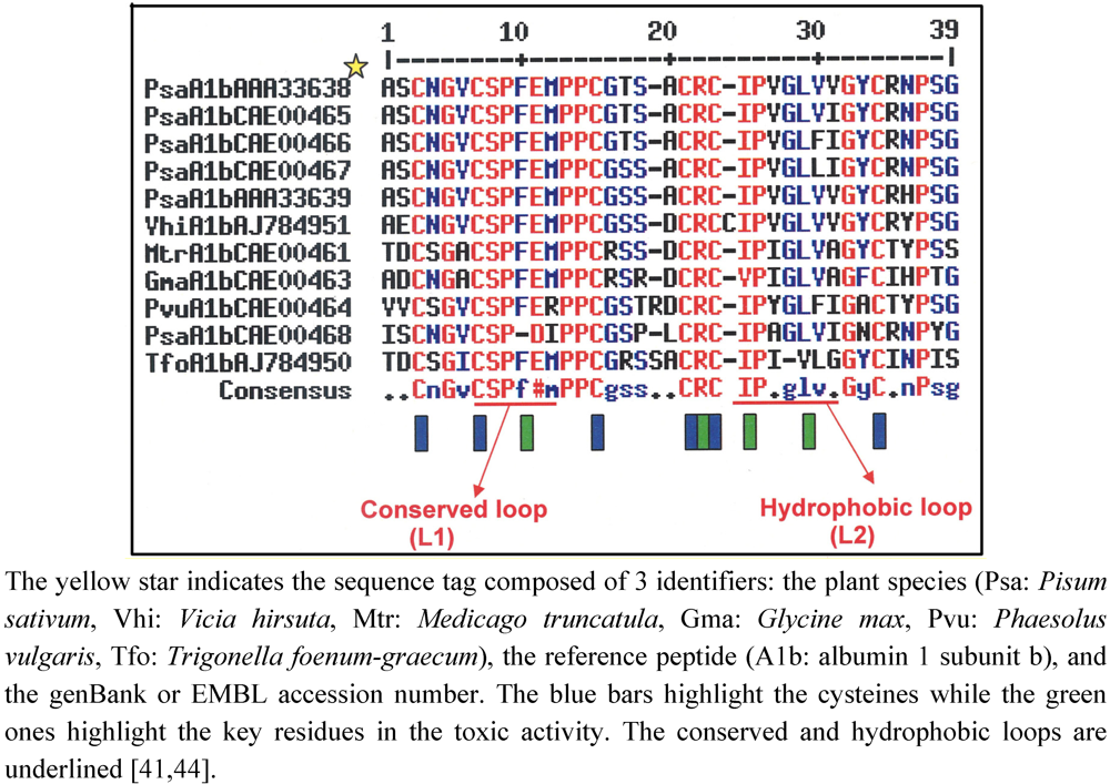 The relevance of the approach described above led to a broader study on 88 additional species scattered amongst the three subfamilies (Caesalpinioideae, Mimosoideae and Papilionoideae) of the Fabaceae [44]. 19 PA1 like genes were characterized from numerous Papilionoideae, but not from Caesalpinioideae or Mimosoideae. The alignment of deduced peptide sequences showed that some amino-acids were particularly well conserved at the structural level; cysteine (6), prolines (5) and some glycines (5), as well as the charged arginine in position 21 (as numbered from the PA1b sequence) ([44]; Figure 3; see also Section 5 in this review). The sequences of these homologues also revealed a two loop peptide sequence highly conserved among Legumes (loop L1, residues 7-15 CSPFE) and a less conserved loop (loop L2, residues 23-31) where the hydrophobic property is conserved (Figure 3)[41,44].These results indicate the importance of these conserved portions (loops L1 and L2) for toxicity.