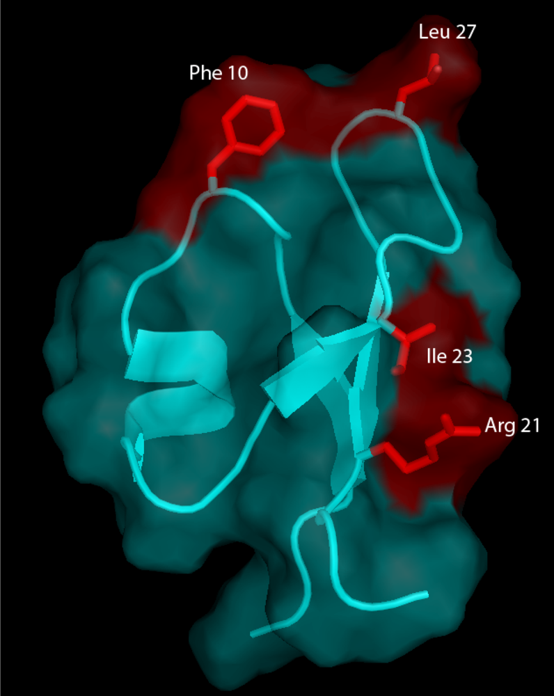 A recent chemical mutagenesis study provides insights into the molecular requirements for the insecticidal activity of PA1b [33]. In this work, the influence of individual residues on the structure and bioactivity of PA1b was investigated. A group of 13 mutants was selected from previous bioinformatic [44] and structural [5] studies which had revealed the importance of residues, located in or around loops L1 and L2, in terms of sequence conservation and/or definition (Figure 4). The thirteen PA1b mutants were chemically synthesized [51] such that the residues involved in the definition of PA1b amphiphilic and electrostatic characteristics were individually replaced with an alanine. The three-dimensional structure of PA1b was outstandingly tolerant of any modifications. Remarkably, receptor binding and insecticidal activities were both dependent on common well-defined clusters of residues located on one single face of the toxin, with Phe-10, Arg-21, Ile-23, and Leu-27 being key residues of the binding interaction (Figure 5).