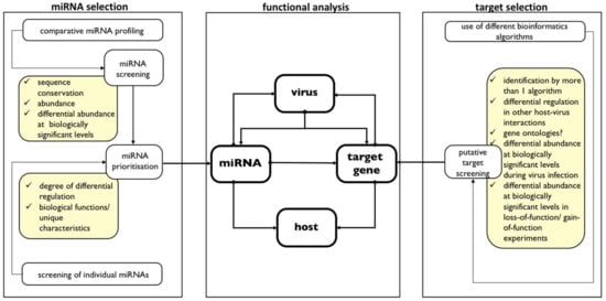Comparative miRNA profiling is only a starting point in determining the role of miRNAs in the host-virus interaction. Typically, many miRNAs are differentially abundant between uninfected and infected samples. The process of confirming a functional impact of a differentially abundant miRNA involves a large research commitment. Therefore, it is helpful to have criteria for selecting which miRNAs to pursue for further analysis for pilot studies. We suggest two-tier miRNA selection criteria (see Figure 1, left panel) which will first screen for miRNAs which are likely to be functional in the host-virus interaction and then identify which of the miRNAs to prioritise.