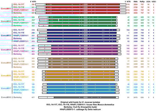 Summary diagram of mitovirus sequences from E. muscae isolates. Mitovirus strains from five different E. muscae isolates, representing eight apparent new mitovirus species, are labeled at left. The RdRp-encoding open reading frame ORF is shown as a colored box within each assembled RNA sequence (see matching colors in Figure 2), starting with the first in-frame AUG codon by convention. The position of the first in-frame stop codon upstream of the proposed AUG start codon is shown as a colored line. Positions of UGA (Trp) codons in each RdRp ORF are shown as white dots. RNA sequences are aligned with respect to the catalytic motif GDD in each deduced RdRp sequence. Positions of two small gaps in sequencing coverage in the assembled EnmuMV2-KVL-14-118 sequence are shown as white breaks in the boxes; asterisks indicate inferred values consequent to these coverage gaps. For each sequence, lengths of the 5´ NTR, 3´ NTR, and overall RNA sequence are labeled in nt; length of the RdRp sequence in aa; and UGA and UGG codons in raw counts.
