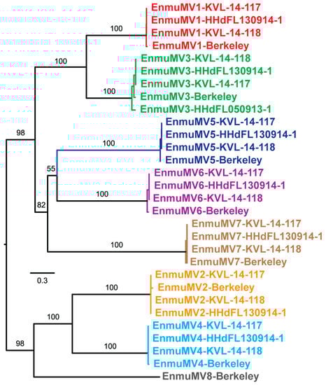 Features of the mitovirus-like contigs described above led us to suspect that there are multiple new mitovirus species represented by these sequences. To address this possibility, we performed pairwise comparisons of the nt sequences using EMBOSS Needleall. These comparisons grouped the sequences into eight distinct clusters, with pairwise identities >86% within each cluster and <50% between any two clusters (Figure S2). The degree of divergence between these clusters, as well as the low identity scores with previously reported mitoviruses found in the BLASTP searches described above (≤42%), led us to conclude that these eight clusters represent eight new mitovirus species. Phylogenetic analyses involving the E. muscae mitoviruses alone corroborated this conclusion by showing the distribution of the 30 viruses into eight well-delimited clades (Figure 2). In addition, by examining which members of each clade derive from which E. muscae isolate, we found that one of the E. muscae isolates (Berkeley; from fruit fly) harbors strains of all eight of the new mitovirus species, three of the E. muscae isolates (KVL-14-117, KVL-14-118, and HHdFL130914-1; from house flies) harbor strains of even of the new mitovirus species, and the remaining one isolate (HHdFL050913-1; from cabbage fly) harbors a strain of only one of the new mitovirus species (Figure 1 and Figure 2). We suggest the names of these new species to be “Entomophthora muscae mitovirus 1” through “Entomophthora muscae mitovirus 8” and further suggest the abbreviations EnmuMV1 through EnmuMV8 for the common names of these viruses. Six of these eight viruses (EnmuMV1, EnmuMV2, EnmuMV4, EnmuMV5, EnmuMV6, and EnmuMV7) are represented by four strains each, one of these viruses (EnmuMV3) is represented by five strains, and the remaining one of these viruses (EnmuMV8) is represented by only one strain in the results presented here. In fact, the few short mitovirus-like contigs assembled from fly-grown E. muscae cabbage fly isolate HHdFL040913-2 are sufficient to identify it as a sixth strain of EnmuMV3, most closely related to EnmuMV3-HHdFL050913-1 (95% nt identity), i.e., from another cabbage fly isolate of E. muscae.