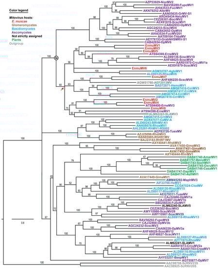 Phylogenetic analyses were next performed to ascertain the positions of the eight E. muscae mitoviruses relative to others in current genus Mitovirus. A representative set of 83 previously reported, full-length mitovirus RdRp sequences were obtained from the Protein database at NCBI and then used in multiple sequence alignments along with the eight mitovirus RdRp sequences from E. muscae isolate Berkeley, plus two RdRp sequences from members of current genus Narnavirus as an outgroup. Each multiple sequence alignment was analyzed using the ModelFinder module within IQ-TREE to identify the best-fit substitution model, which was then directly applied for maximum-likelihood phylogenetic analyses within IQ-TREE. As shown by the representative phylogram in Figure 3, the results reveal that EnmuMV1–EnmuMV8 (red) all cluster within the same discernible subclade of current genus Mitovirus, within a portion of the major clade previously designated Ia. This clustering suggests that all eight of these mitoviruses from E. muscae shared a most recent common ancestor, from which they all diverged, near the root of this subclade (red arrow in Figure 3), i.e., fairly early in mitovirus evolution but still well removed from the root.