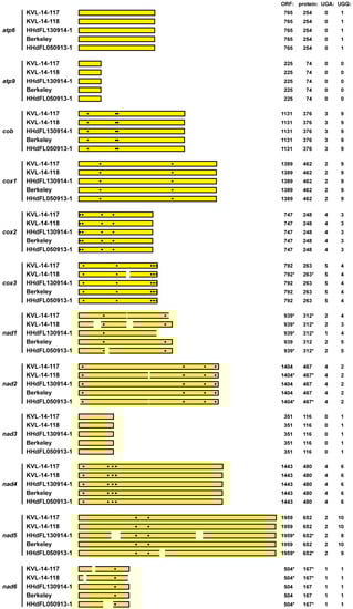 To provide additional evidence that these transcript contigs from E. muscae isolate Berkeley represent the respective mitochondrial genes of E. muscae, we used the contigs to search the SRA transcriptome libraries from the four other E. muscae isolates KVL-14-117, KVL-14-118, HHdFL130914-1, and HHdFL050913-1. The results summarized in Figure 4 reflect that nearly identical coding sequences for all 12 mitochondrial genes were assembled from sequence reads from all four other E. muscae isolates. Complete coding sequences were assembled for eight to ten of these genes from each isolate and partial coding sequences for the other genes (Figure 4), with single-nt mismatches at only a few nt positions between any two isolates. These findings provide further strong support for the conclusion that these 12 mitochondrial coding sequences indeed derive from E. muscae.