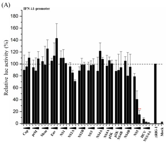 3.2. ZIKV NS5 Strongly Inhibits the Activation of IFN-λ1 and IFN-β Promoters