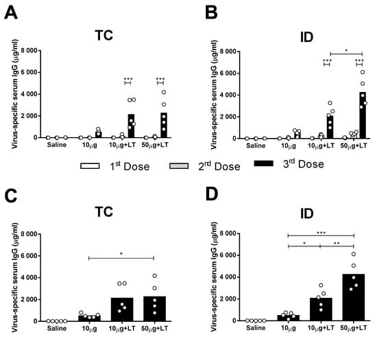 Male BALB/c mice received three vaccine doses via the TC or ID route with either 10 or 50 μg of concentrated DENV2 particles (NGC strain) with or without purified LT1 (Figure S1E). As shown in Figure 1, the mice inoculated with DENV2 mounted a low antigen-specific IgG response following the TC and ID immunizations (Figure 1A,B). The addition of LT1 to the vaccines significantly enhanced the DENV2-specific serum IgG responses elicited in the mice immunized via the TC or ID route, with the maximal values reached two weeks after the third vaccine dose (Figure 1A,B). Similar serum antibody responses were also measured in mice immunized virus particles purified from cell culture supernatants by anionic chromatography (Figure S2).