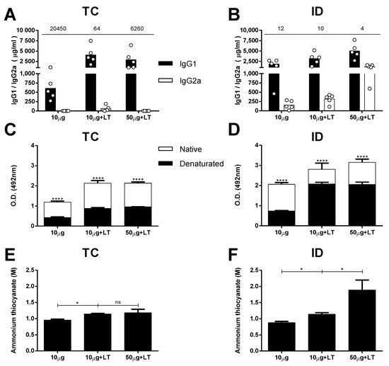 We first measured the IgG-specific subclass responses in the mice subjected to different immunization regimens. The serum IgG1 subclass response prevailed in the mice immunized without adjuvant two weeks after they received the third dose. A higher IgG1/IgG2a ratio was observed among the mice immunized via the TC route compared with that of the mice immunized via the ID route (Figure 2A,B). The mice immunized with LT1 also developed a predominant IgG1 response, but those immunized with the higher antigen dose developed a more balanced IgG1/IgG2a ratio, particularly the animals immunized via the ID route (Figure 2A,B).