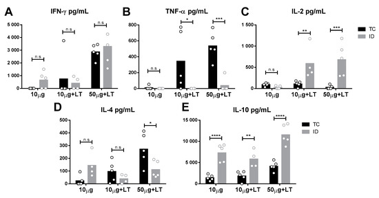 To analyze the immune responses elicited in the vaccinated mice, we assessed the cytokine secretion profile of spleen cells collected two weeks following the administration of the last vaccine dose. As indicated in Figure 3, different cytokine secretion patterns were observed according to the tested administration route. Mice immunized via the TC route showed higher tumor necrosis factor alpha (TNF-α) and interleukin 4 (IL-4) levels than shown by those immunized via the ID route (Figure 3B,D). In contrast, ID-immunized mice mounted higher IL-10 and IL-2 responses than shown by those immunized via the TC route (Figure 3C,E). Nonetheless, an increase in interferon gamma (IFN-γ) was found following immunization via both routes. Flow-cytometry assays were also performed with spleen cells after the immunization protocols prior to challenge, but no significant difference among immunized versus nonimmunized mice was observed [].