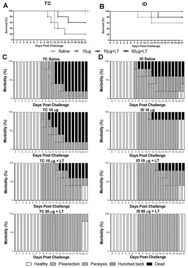 Protective immunity induced in mice after immunization via TC or ID routes with DENV2 New Guinea C (NGC). Survival and morbidity curves were mounted after inoculation of lethal intracranial (i.c.) challenge with 1 × 106 NGC virus particles 2 weeks after the 3rd immunization dose (n = 5). (A,B) Survival curves of mice immunized via TC (A) or ID (B) routes following a lethal challenge with the DENV2 NGC strain. (C,D) Morbidity curves of mice immunized via TC (C) or ID (D) routes following the lethal challenge. Statistical analysis performed by Mantel–Cox test. * p < 0.05.