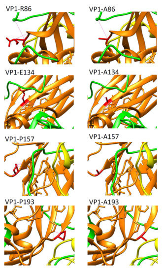 To further examine the effects of alanine substitutions on capsid protein interaction, we utilized the UCSF chimera as a protein structure analysis tool to predict the capsid protein interaction. The results indicated that VP1-E134A and VP1-G231A showed no change in interaction with other residues; however, VP1-R86A, VP1-P157A, VP1-P193A, and VP1-K256A resulted in interaction alternation with the capsid proteins, as shown in Figure 6. Most of these residues demonstrated interaction loss after alanine substitution. The VP1-R86A and VP1-K256A not only presented a positive charge change, but also demonstrated interaction dismissed with VP3 and VP4, respectively. The data also demonstrated the loss of interactions with VP1 protein for the VP1-P157A, and the loss of one of the two interactions with the VP1 protein for the VP1-P193A (Figure 6).