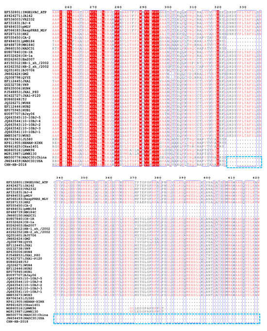 NSP2 (the largest nonstructural protein) and GP5 (a major envelope protein) are the most variable PRRSV proteins, so the two viral proteins are commonly used to analyze PRRSV variation and strain classification [,]. GP3, a highly soluble glycosylated protein with low homology among PRRSV strains, contains multiple epitope regions [,]. In this study, we compared alterations between CHN-HB-2018 and another 42 PRRSV-2 representative strains in amino acid sequences of NSP2, GP3, and GP5. As shown in Figure 4, the CHN-HB-2018 strain showed a discontinuous 131-aa deletion in NSP2 at positions 323–433, 481, and 504–522, which are typical deletions of the NADC30-like strain prevalent in China []. Importantly, an additional 5-aa deletion at position 464–468 was observed in the NSP2 of the CHN-HB-2018 strain, which has not been reported before.