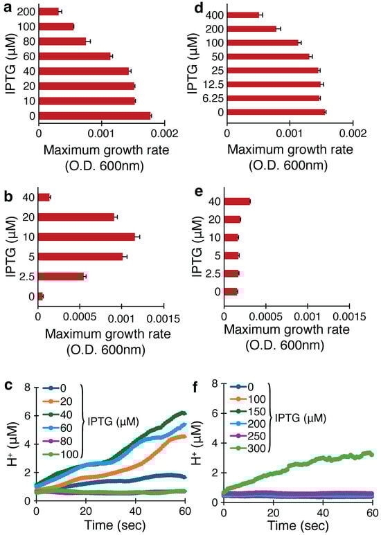 DH10B cells were grown overnight in Lysogeny Broth (LB) at 37 °C, diluted 500-fold, and grown until they reached an OD600 of 0.2. Then, 50 L of the desired solution, along with another 50 L of this cell culture, was added to a 96-well plate. Different concentrations of Isopropyl--D-1-thiogalactopyranoside (IPTG) were added along with 1% D-glucose, and controls were taken without IPTG induction. The plate was incubated in a multiplate reader (LogPhase 600 from BioTek; Santa Clara, CA, USA) at 37 °C for 16 h. Readings were taken at 15 min time intervals and plotted over time. Duplicate or triplicate sets were conducted for each experiment.