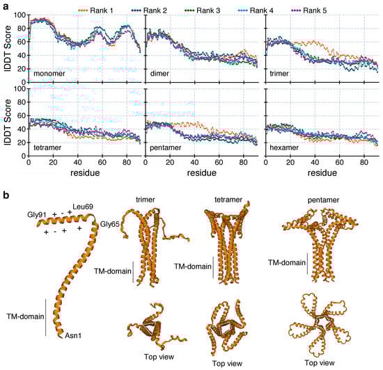 The monomeric unit shows high lDDT per residue for 2–20, 55–60, and 75–82 sequence ranges (more than 90%). However, for other oligomers, the maximum lDDT value drops appreciably. For the dimer, trimer, tetramer, pentamer, and hexamer, the maximum lDDT values are 78%, 67%, 55%, 52%, and 48% respectively. We need to consider a second geometrical constraint before assigning the most probable ion-channel structure. Proteins with a single TM domain can only form a membrane-permeable channel if the degree of oligomerization is three or more []. Figure 2b reveals the presence of pore-like geometry for the trimer, tetramer, and pentamer. According to Dai et al., the most common oligomerization states of pore-forming helices are four or five, where the pore sizes optimally act as ion channels []. Considering this, we found that between the tetramer and pentamer, the pentameric assembly shows a higher overall sequence-wise confidence value. It is evident from Figure 2a, that the tetrameric assembly has only 20 residues with a comparably high lDDT score (ranging in 48–55%), whereas for the pentamer, around 45 residues have comparable high values (44–52% lDDT range).