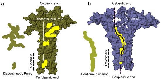 Figure 3 shows the analyzed probable pore/channel structures and their position in the tetramer and pentamer. The tetramer shows no continuous channel across the transmembrane domain; rather, two discrete branched pore structures were found. On the other hand, the pentameric structure exhibited a continuous channel from the periplasmic end, spanning across the transmembrane domain, up to the open end of the cytosolic side.