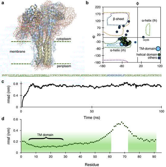 Figure 4 depicts the outcome of a 100 ns simulation of a stable membrane-embedded structure. A plot of the root mean squared deviation (RMSD) of the protein backbone as a function of time reveals a stable backbone for a long range of time, Figure 4c. In particular, the RMSD value of the backbone jumps to 0.8 nm within the first 10 ns and remains almost in the same range for the next 90 ns. The time-averaged Ramachandran plot of different residues (Figure 4b) shows the prevalence of an -helical structure. Different color coding depicts different regions of a single protein strand: light blue points show the dihedral angles for the TM domain residues, whereas dark green and blue points represent angles of the non-transmembrane helical and non-helical segments, respectively. As expected, the TM domain shows a helical nature, whereby the time-averaged Φ-Ψ angle remains within the right-handed -helical zone of the Ramachandran plot. However, the other helical zones (residues 28–59 and 60–91) show considerable fluctuation. Figure 4b shows these residues as small blue dots, scattered around non-helical quadrants of the Ramachandran plot.
