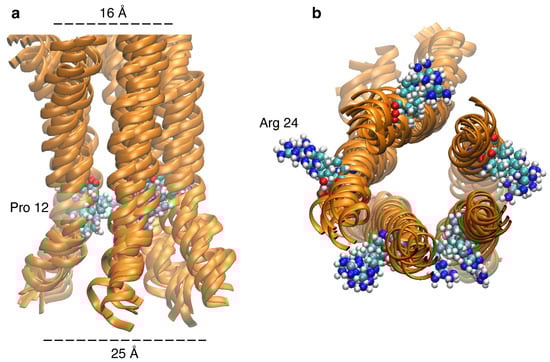 A closer look at the TM domain of the ion channel reveals that the channel has a wide opening, where the helical units are somewhat tilted outwards due to the presence of Pro12 in the middle of the TM domain (Figure 6a). Moreover, the Arg24 sidechains project outwards to stabilize the negative charges of the phospholipid head groups (Figure 6b). We deduce that these factors, along with the previously discussed structural features, are consistent with the positive experimental results of CCHF-V-gp.