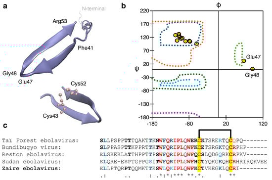 (a) –turn of the Ebola delta peptide C-terminal showing the vicinity of the two Cys residues. (b) Ramachandran plot of the -turn zone showing the dihedral angles. (c) Sequence alignment of different Ebola viruses showing the conserved residues in color. The two S-S bond-forming Cys residues are marked in yellow. * (asterisk): All sequences have the exact same amino acid at this position (fully conserved). : (colon): All amino acids at this position have highly similar properties; . (period): Amino acids have moderately similar properties.