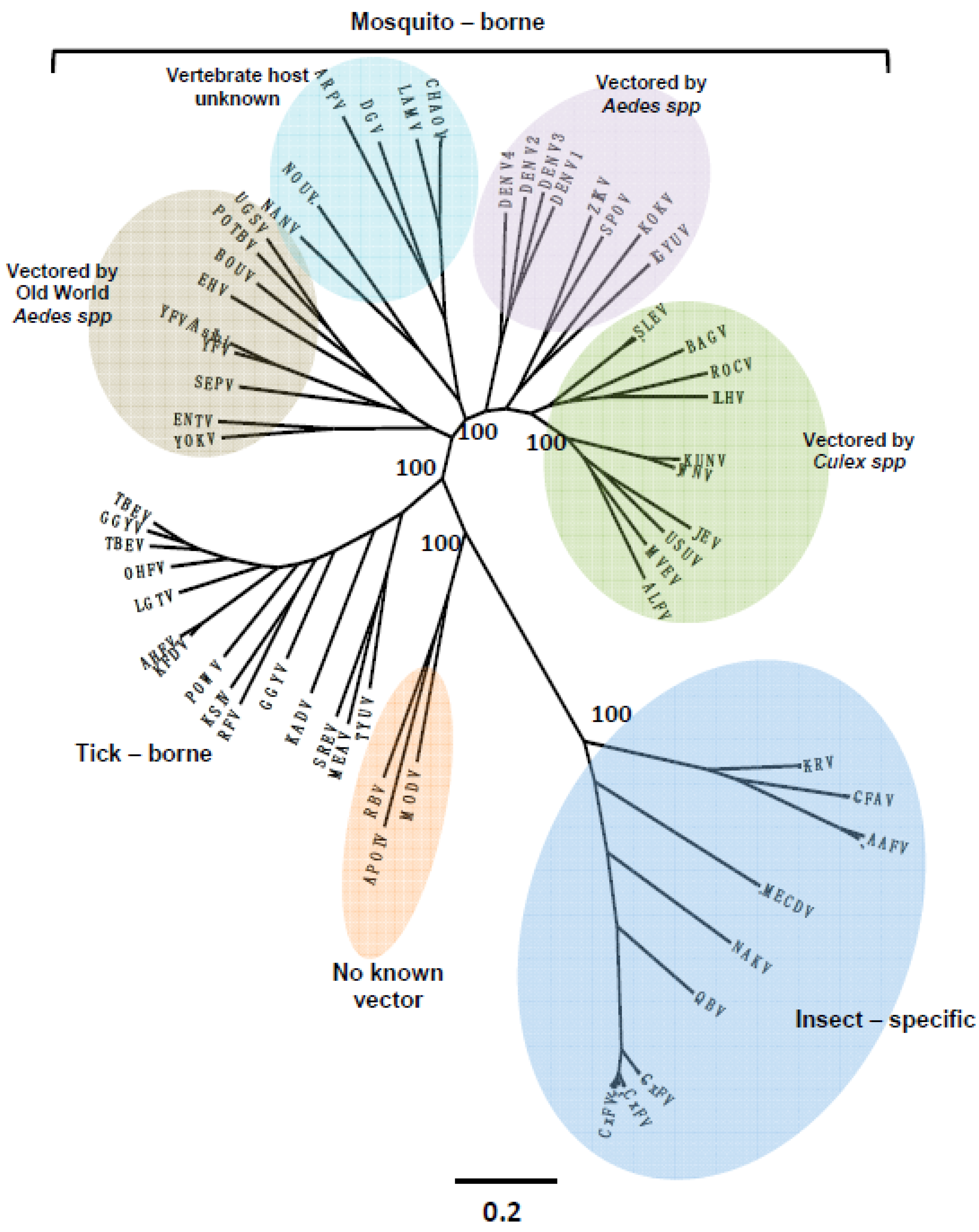 The term “insect-specific” refers to viruses that naturally infect mosquitoes and replicate in mosquito cells in vitro, but do not appear to replicate in vertebrate cells or to infect humans or other vertebrates. Insect-specific viruses were first described within the genus Flavivirus, family Flaviviridae. Cell fusing agent virus (CFAV), isolated 40 years ago, was the first insect-specific flavivirus characterized [1]. CFAV was isolated from culture fluid of an Aedes aegypti cell line, which produced massive syncytia when inoculated into a culture of Aedes albopictus cells, but it failed to replicate in three vertebrate cell lines (BHK-21, KB, and Vero) tested [1]. The complete nucleotide sequence for CFAV was determined approximately 15 years later and was found to be distantly related to other flaviviruses based on deduced amino acid sequences [2]. Sequence identities between CFAV and other flaviviruses were highest for the NS5 and NS3 genes, with 45% and 34% amino acid similarities, respectively. More recently, CFAV has been detected in field-caught Aedes and Culex spp. mosquitoes from Puerto Rico [3], Indonesia [4], Thailand [5], Mexico [6], and the United States (R. Tesh and N. Vasilakis, unpublished data). Phylogenetic analyses of the genus Flavivirus suggest that CFAV may represent a basal, possibly ancestral, lineage [2,7].