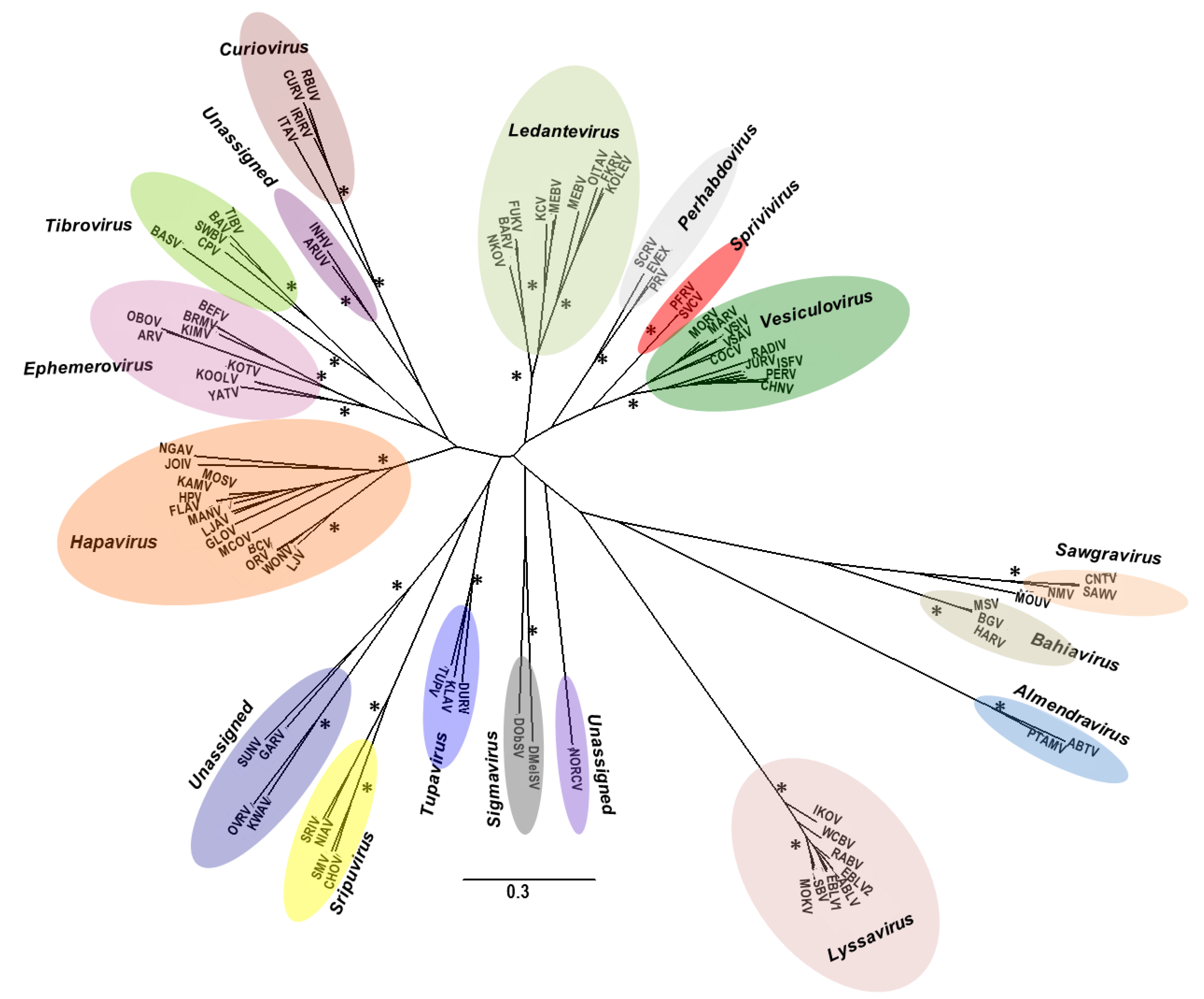 Rhabdovirus: Maximum-likelihood (ML) analysis of rhabdovirus L protein sequences. Horizontal branch lengths are drawn to a scale of amino acid substitutions/site, and all bootstrap support values ≥85% are indicated by an asterisk. Cytorhabdovirus, novirhabdovirus and nucleorhabdovirus outgroup sequences were excluded from the tree as they were too divergent to establish a reliable rooting. The tree is therefore rooted arbitrarily on one of two basal clades (genera Almendravirus and Bahiavirus) that comprise viruses isolated from mosquitoes. Branch labels indicate virus abbreviation. Additional virus isolate information is contained in a supplemental file. (Adapted from [73]).
