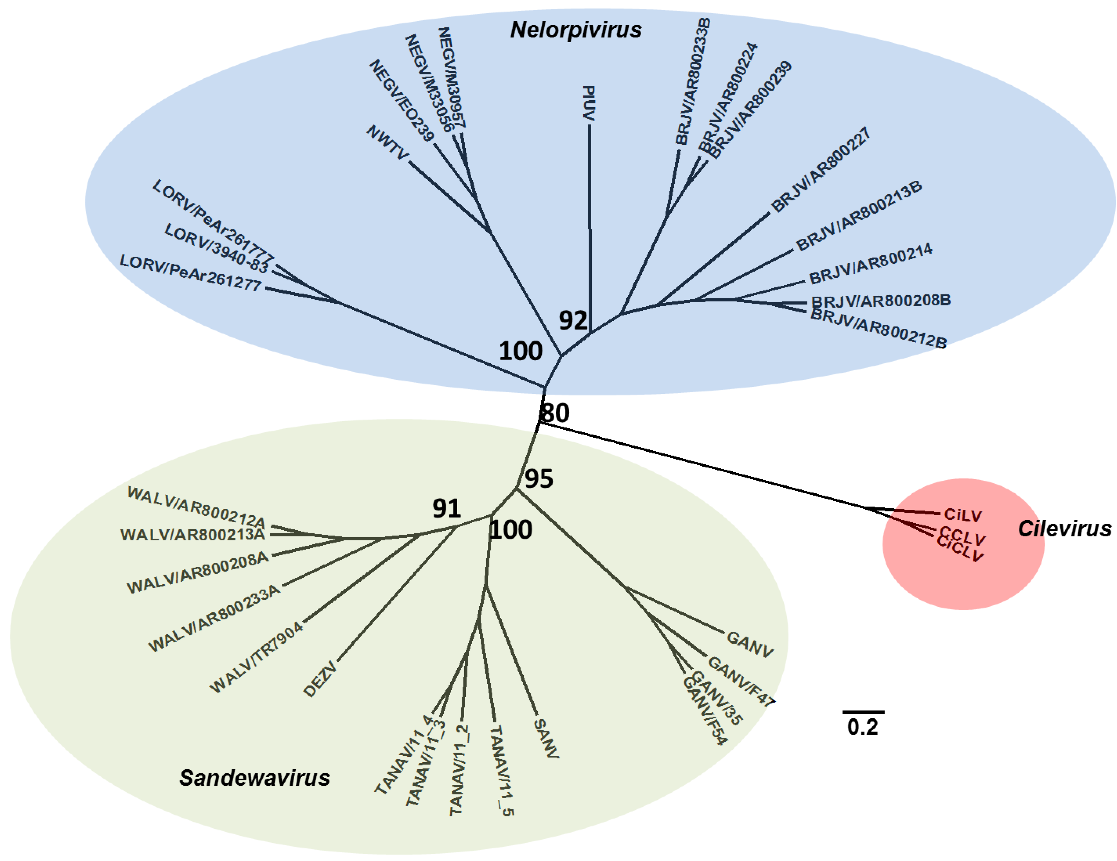 In addition to the classical arboviral pathogens such as dengue, yellow fever, chikungunya, Rift Valley fever and Japanese encephalitis viruses, mosquitoes are also infected with a wide variety of insect-specific viruses. This latter group is comprised of a growing number of largely RNA viruses, belonging to many different taxa including Flaviviridae (Figure 2), Rhabdoviridae (Figure 3), Mesoniviridae (Figure 4), negeviruses (Figure 5), and Togaviridae (Figure 6). Although insect-specific viruses do not infect vertebrates, they are nonetheless an important part of the mosquito microbiome. The recent development and wide availability of methods for full genome sequencing and metagenomics have revealed many novel insect-specific viruses [6,69,70,71,72]; yet little is known about their ecology or their effect on the mosquito host.