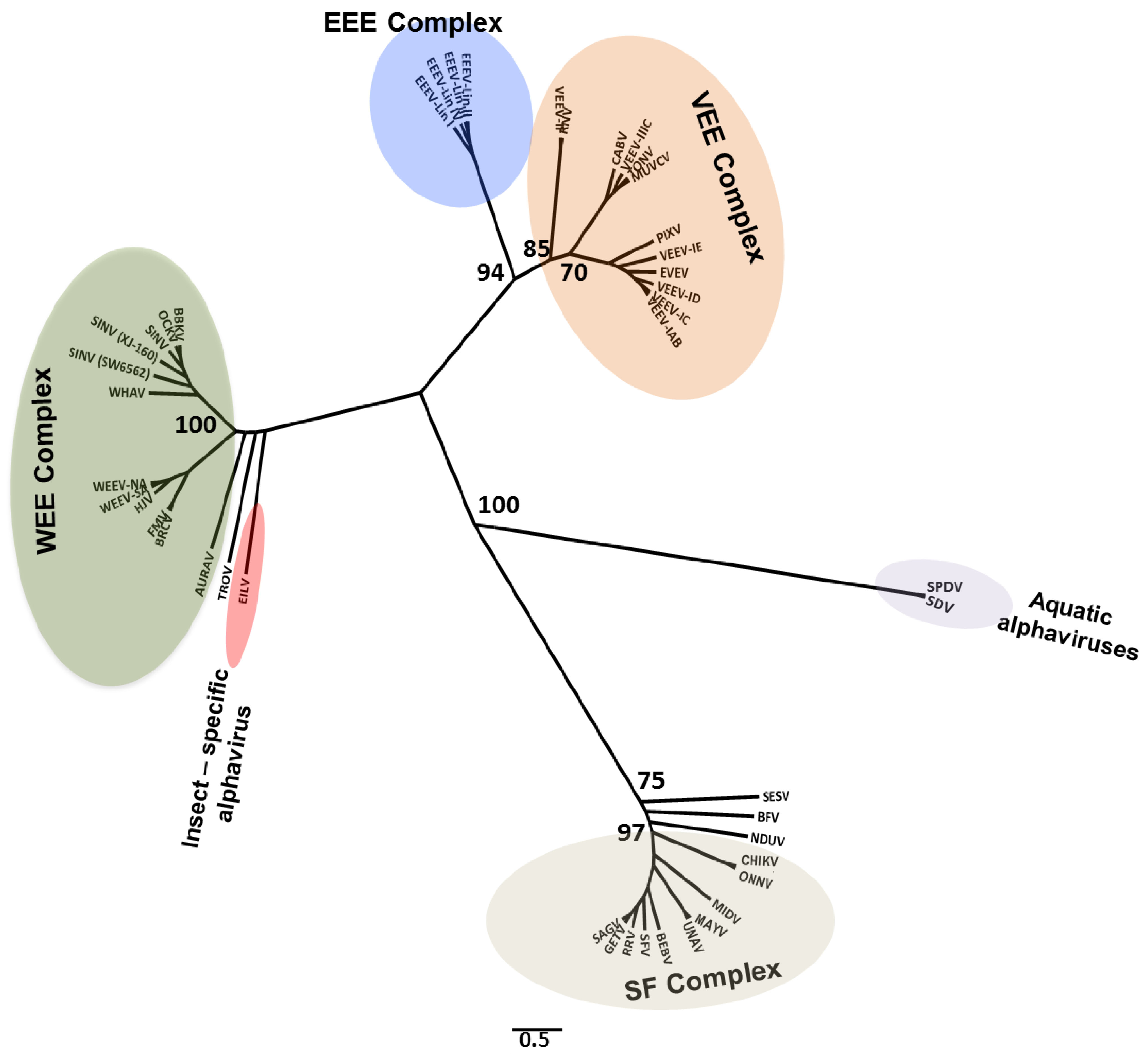 Arbovirus transmission cycles have three essential components: the virus, the hematophagous arthropod vector, and the vertebrate host [62]. Arboviruses sensu strictu are maintained in nature by propagative biological transmission, where the virus replicates in two disparate systems: the invertebrate vector and the vertebrate host [63]. In contrast, insect-specific viruses lack the ability to replicate in vertebrate cells. To date, most insect-specific viruses have been isolated using C6/36 (A. albopictus) cells, with some studies attempting propagation in several different vertebrate cell lines in order to confirm this host-restriction characteristic [12,16,34]. Recent studies with an insect-specific alphavirus, Eilat virus (EILV), suggest that the basis for host-restriction is multigenic and viral replication is limited at multiple levels [64].