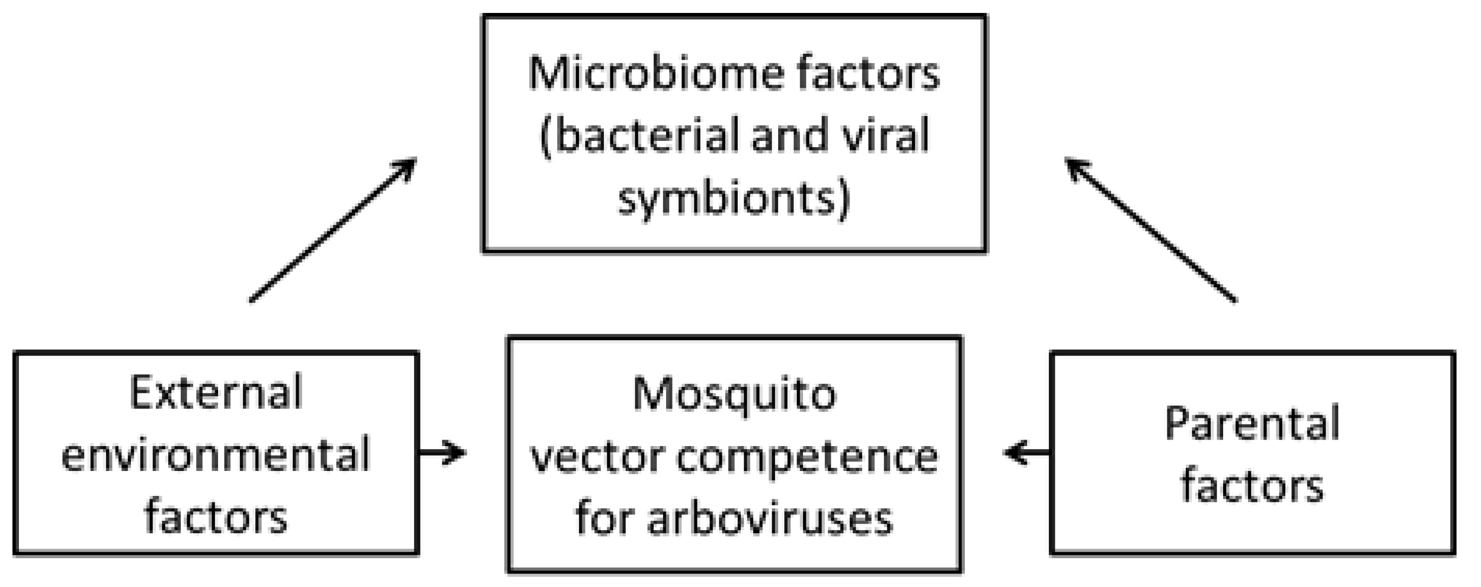 Much has been written about the replication of arboviruses in insects and insect cells, as well as descriptions of the innate and adaptive immune responses of insect cells to arbovirus infection [81,82]. In contrast, little is known about the response of insects or insect cells to infection with most of the newly discovered RNA insect-specific viruses. However, based on recent findings that bacterial symbionts of mosquitoes can alter the insects’ vector competence for certain arboviruses [83,84,85], some of the insect-specific viral symbionts of mosquitoes may have a similar effect (Figure 7), either as a result of superinfection exclusion [86,87,88] or alteration of the vector’s immune system [81,82].
